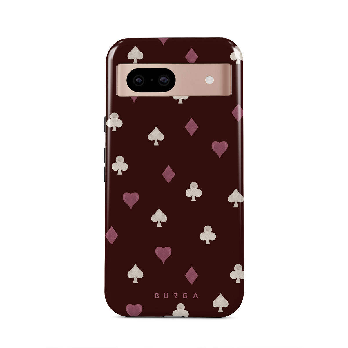 Nothing is as it appears. Hearts, clubs, diamonds, and spades—stacked in your favor or playing against you? This Google Pixel 8a phone case design features a rich burgundy background and minimalist suits that make for a game where the rules are constantly shifting.