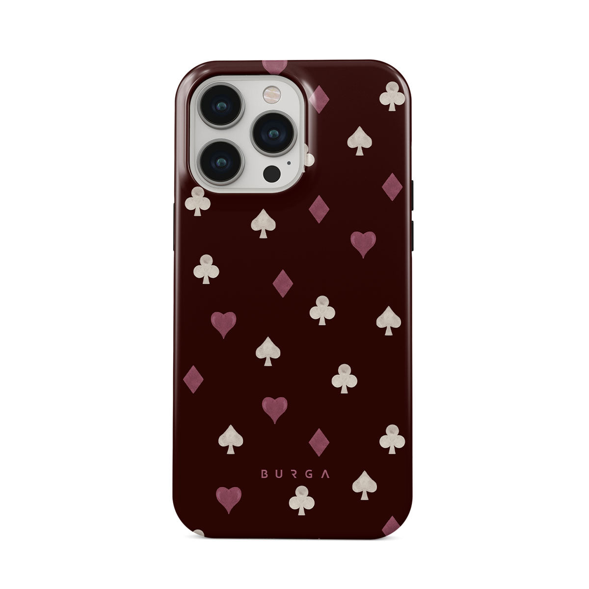 Nothing is as it appears. Hearts, clubs, diamonds, and spades—stacked in your favor or playing against you? This iPhone 14 Pro Max phone case design features a rich burgundy background and minimalist suits that make for a game where the rules are constantly shifting.