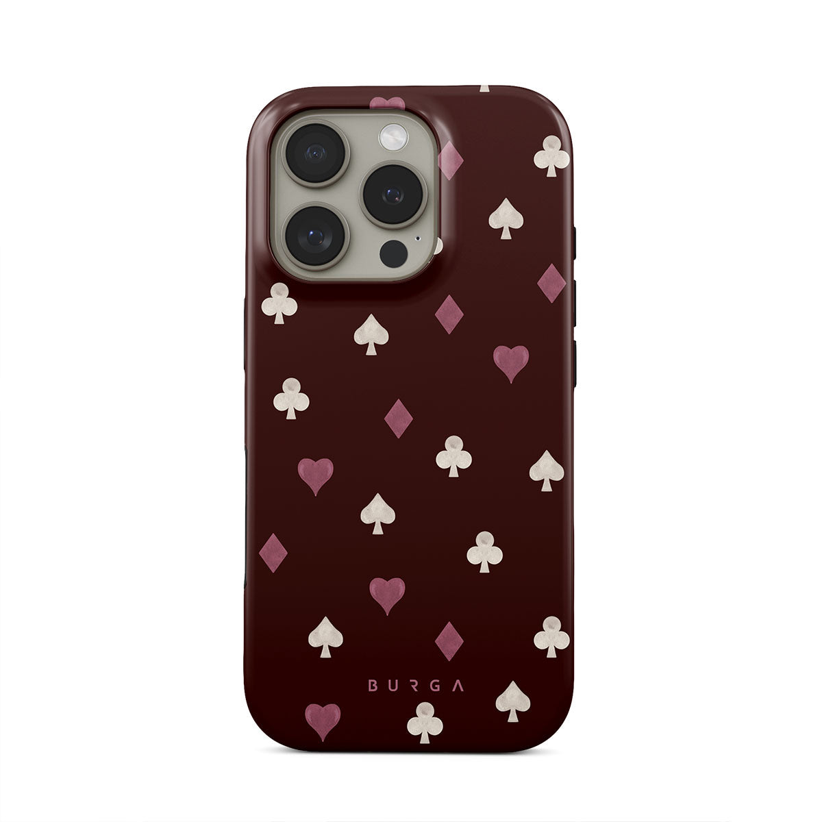 Nothing is as it appears. Hearts, clubs, diamonds, and spades—stacked in your favor or playing against you? This iPhone 16 Pro phone case design features a rich burgundy background and minimalist suits that make for a game where the rules are constantly shifting.