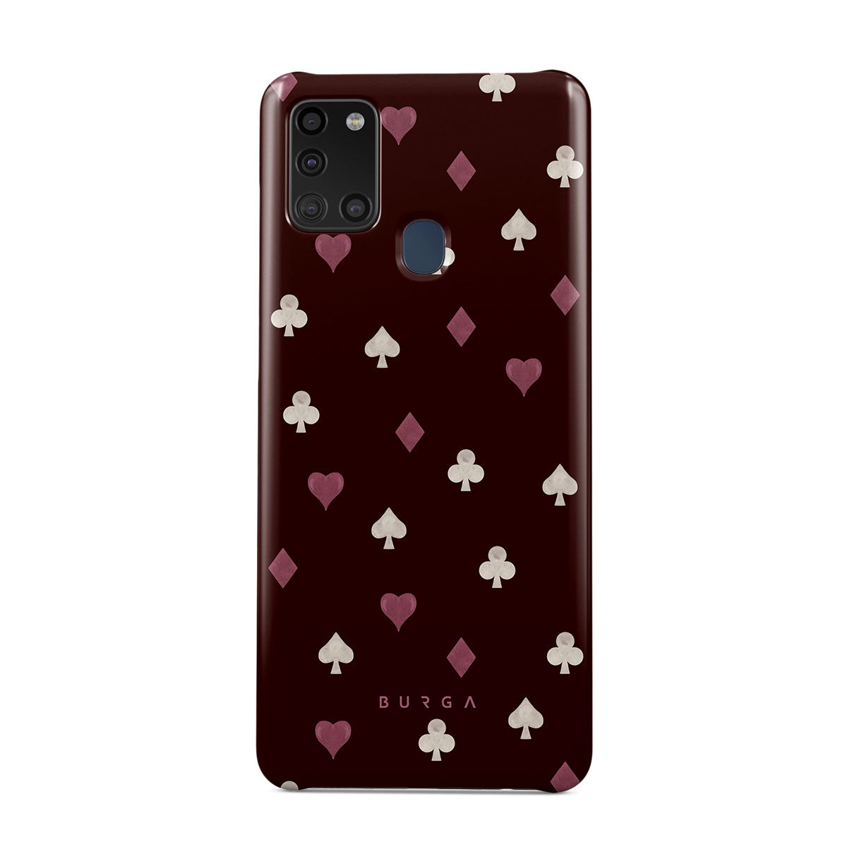 Nothing is as it appears. Hearts, clubs, diamonds, and spades—stacked in your favor or playing against you? This Samsung Galaxy A21s 4G phone case design features a rich burgundy background and minimalist suits that make for a game where the rules are constantly shifting.