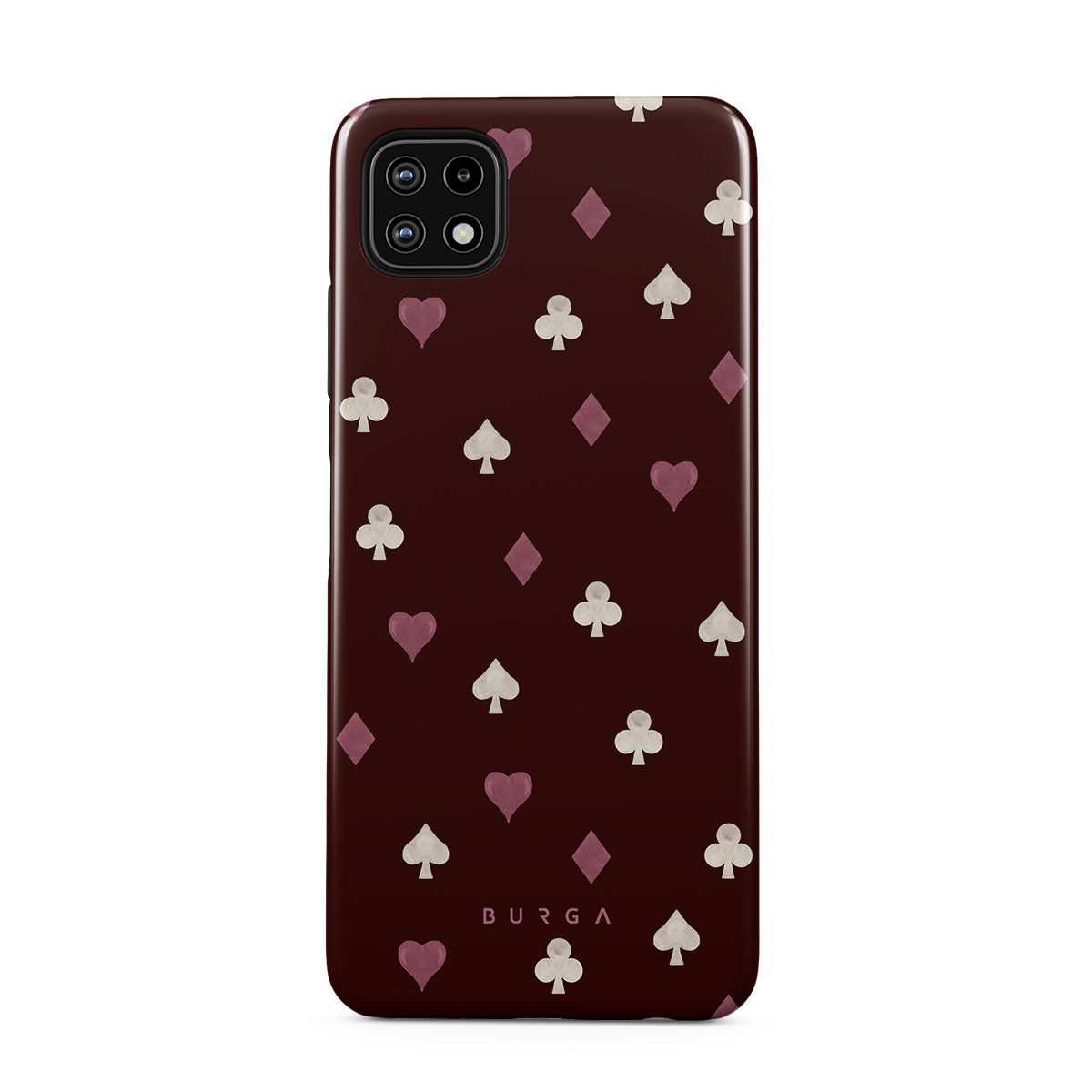 Nothing is as it appears. Hearts, clubs, diamonds, and spades—stacked in your favor or playing against you? This Samsung Galaxy A22 5G phone case design features a rich burgundy background and minimalist suits that make for a game where the rules are constantly shifting.