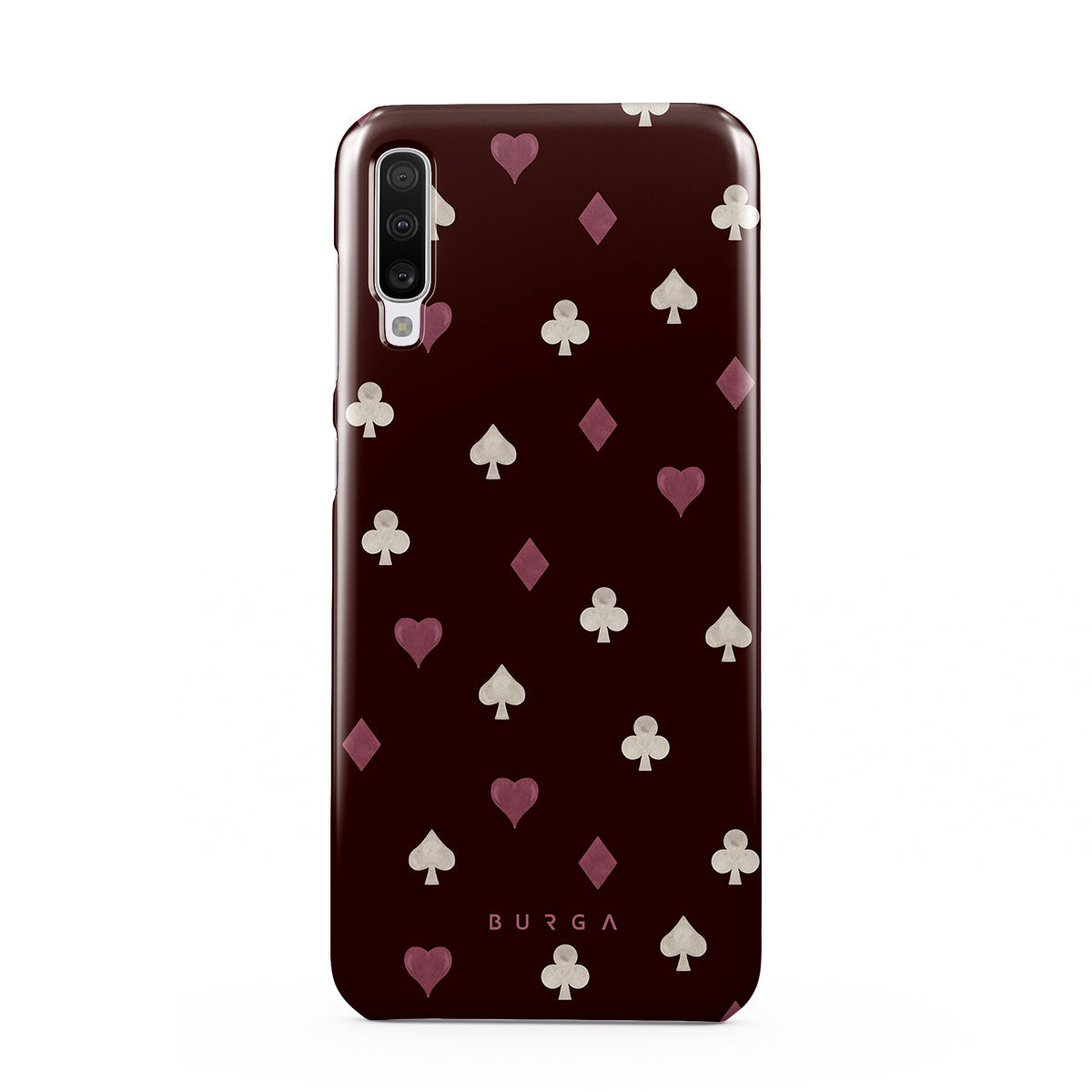 Nothing is as it appears. Hearts, clubs, diamonds, and spades—stacked in your favor or playing against you? This Samsung Galaxy A70 phone case design features a rich burgundy background and minimalist suits that make for a game where the rules are constantly shifting.