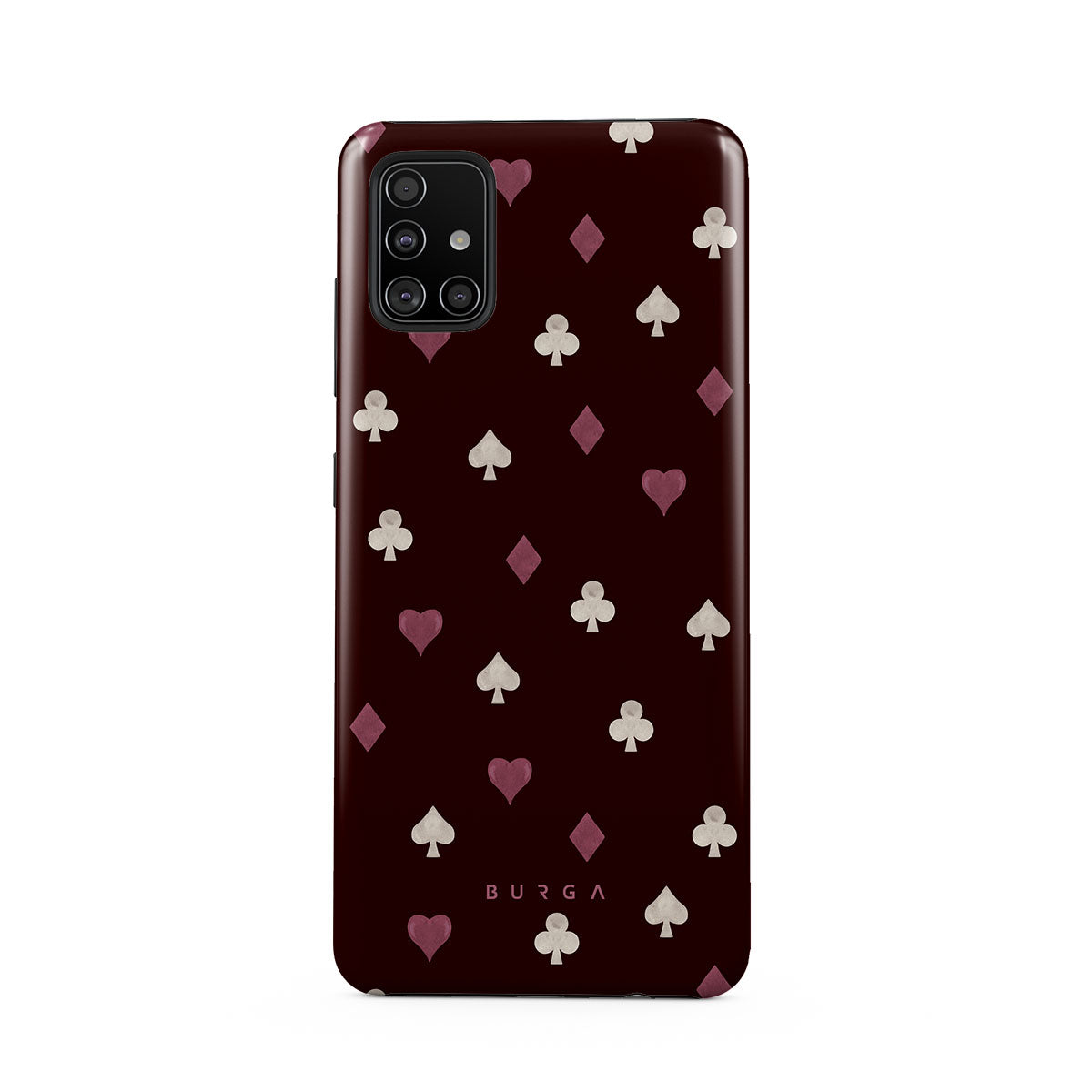 Nothing is as it appears. Hearts, clubs, diamonds, and spades—stacked in your favor or playing against you? This Samsung Galaxy A71 4G phone case design features a rich burgundy background and minimalist suits that make for a game where the rules are constantly shifting.