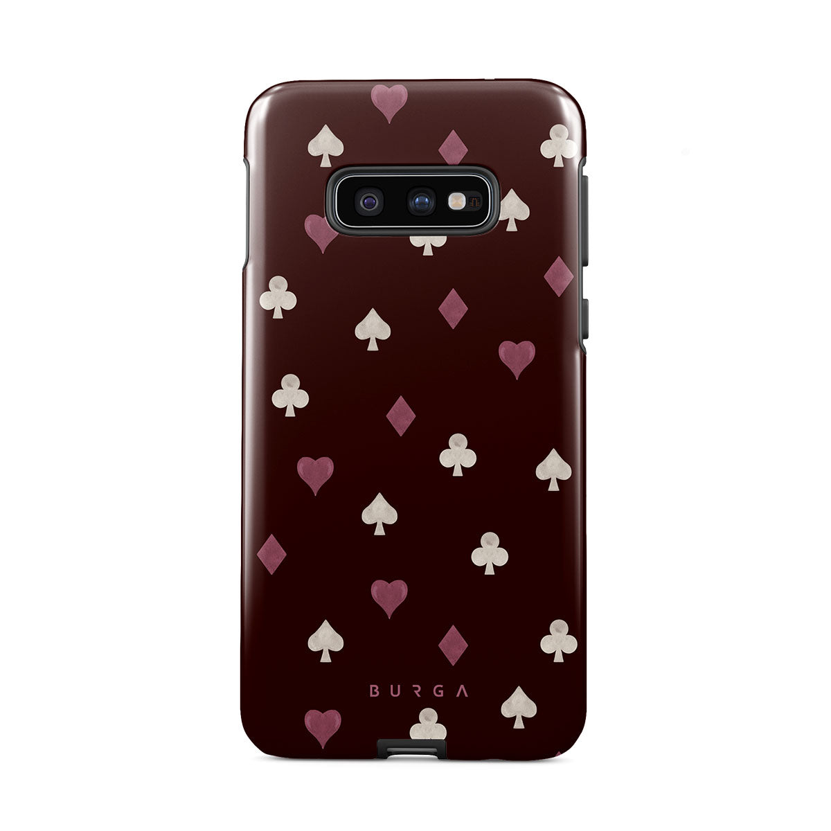 Nothing is as it appears. Hearts, clubs, diamonds, and spades—stacked in your favor or playing against you? This Samsung Galaxy S10E phone case design features a rich burgundy background and minimalist suits that make for a game where the rules are constantly shifting.