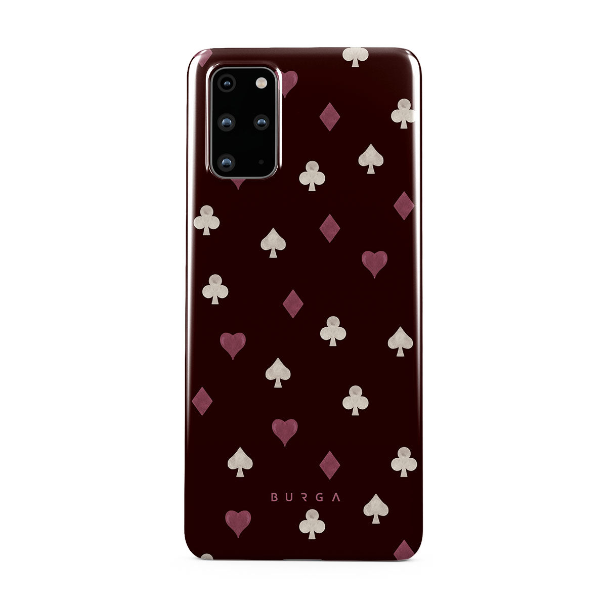 Nothing is as it appears. Hearts, clubs, diamonds, and spades—stacked in your favor or playing against you? This Samsung Galaxy S20 Plus 4G / 5G phone case design features a rich burgundy background and minimalist suits that make for a game where the rules are constantly shifting.