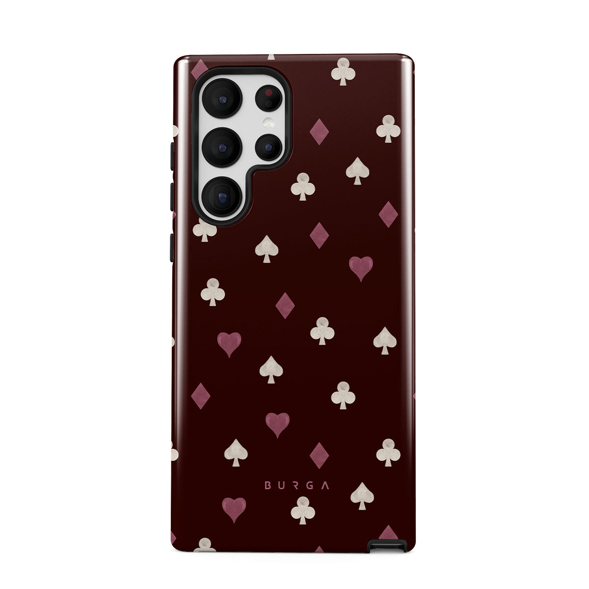 Nothing is as it appears. Hearts, clubs, diamonds, and spades—stacked in your favor or playing against you? This Samsung Galaxy S22 Ultra phone case design features a rich burgundy background and minimalist suits that make for a game where the rules are constantly shifting.