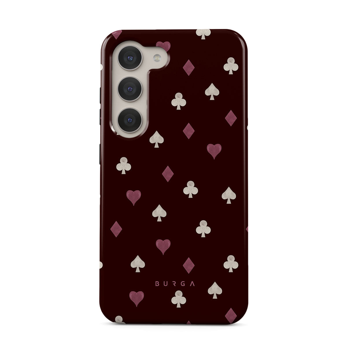 Nothing is as it appears. Hearts, clubs, diamonds, and spades—stacked in your favor or playing against you? This Samsung Galaxy S23 Plus phone case design features a rich burgundy background and minimalist suits that make for a game where the rules are constantly shifting.