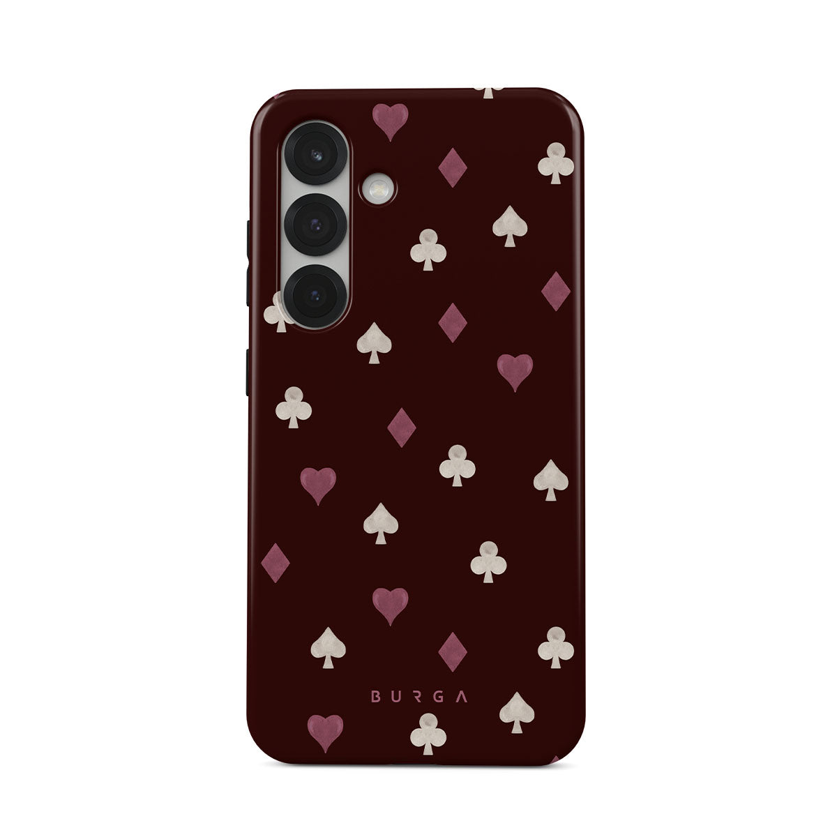 Nothing is as it appears. Hearts, clubs, diamonds, and spades—stacked in your favor or playing against you? This Samsung Galaxy S25 phone case design features a rich burgundy background and minimalist suits that make for a game where the rules are constantly shifting.