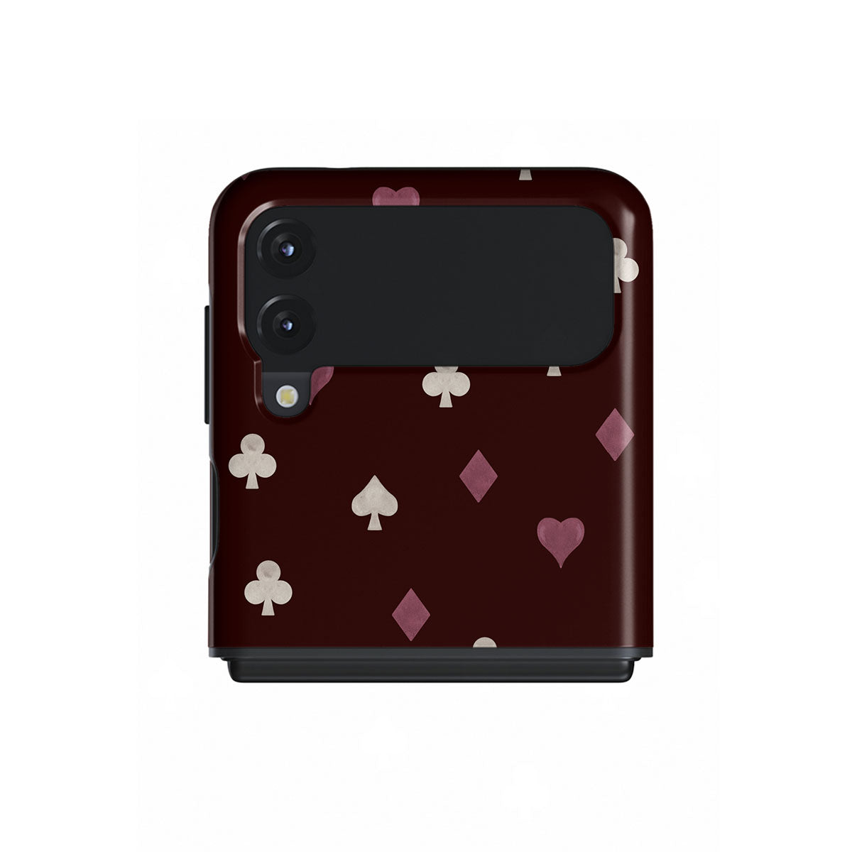 Nothing is as it appears. Hearts, clubs, diamonds, and spades—stacked in your favor or playing against you? This Samsung Galaxy Z Flip 3 phone case design features a rich burgundy background and minimalist suits that make for a game where the rules are constantly shifting.