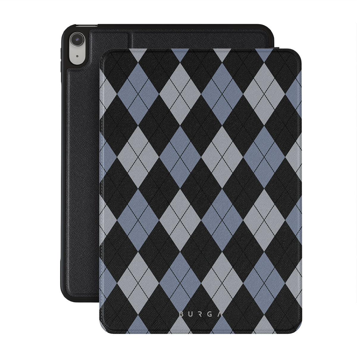 Discover our Trouble iPad 10.9 (A16/10th Gen) folio case design—a classic argyle pattern featuring stark black diamonds that seamlessly blend with two distinct shades of blue. Made for those who respect the classics but aren't afraid to disrupt the norm.