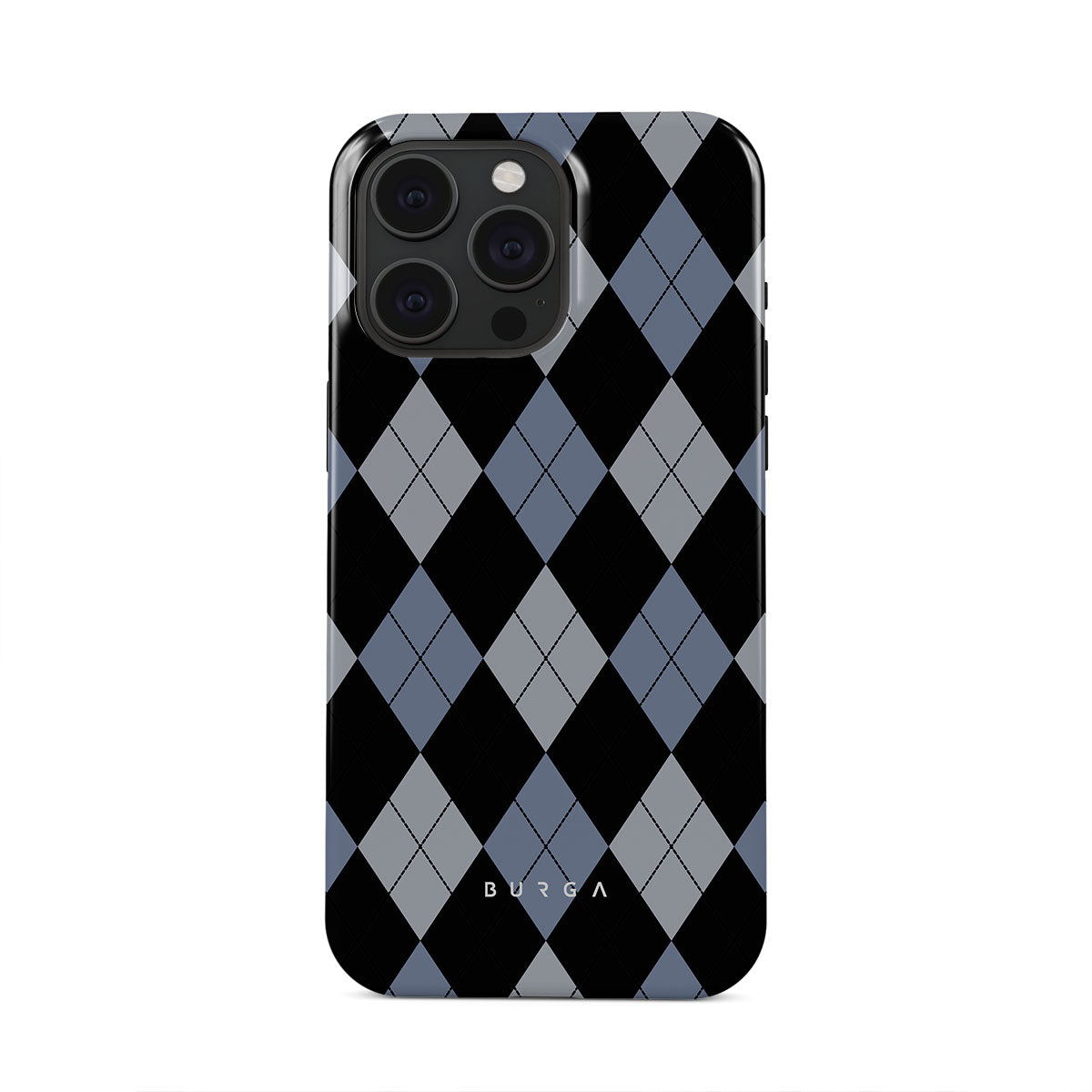 Discover our Trouble iPhone 15 Pro Max phone case design—a classic argyle pattern featuring stark black diamonds that seamlessly blend with two distinct shades of blue. Made for those who respect the classics but aren't afraid to disrupt the norm.
