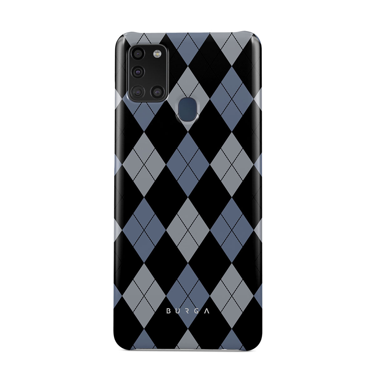 Discover our Trouble Samsung Galaxy A21s 4G phone case design—a classic argyle pattern featuring stark black diamonds that seamlessly blend with two distinct shades of blue. Made for those who respect the classics but aren't afraid to disrupt the norm.