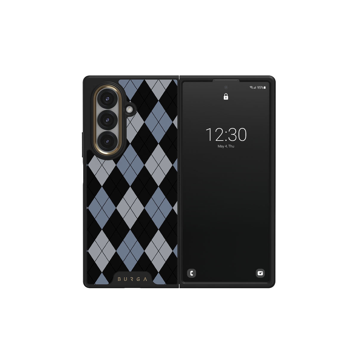 Discover our Trouble Samsung Galaxy Z Fold 7 phone case design—a classic argyle pattern featuring stark black diamonds that seamlessly blend with two distinct shades of blue. Made for those who respect the classics but aren't afraid to disrupt the norm.