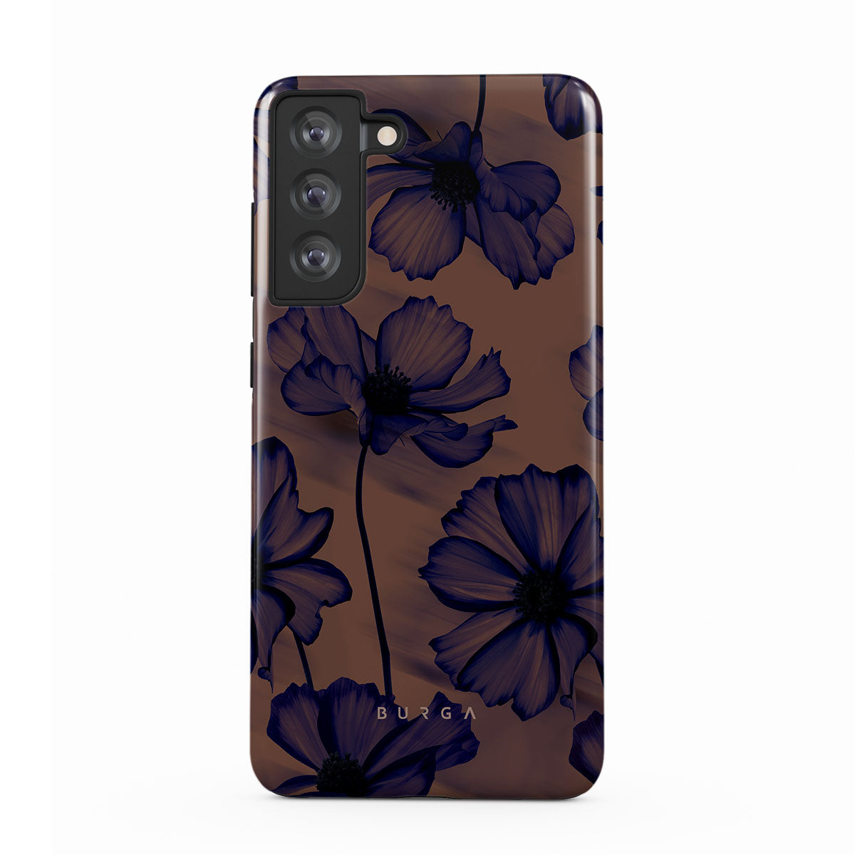 Discover our Velvet Night design. On a soft nude backdrop, blue poppies dance in the untamed rhythm of the wind. A blend of night's peace and daring energy, this Samsung Galaxy S21 FE phone case is perfect for those who dream big and seek adventure.