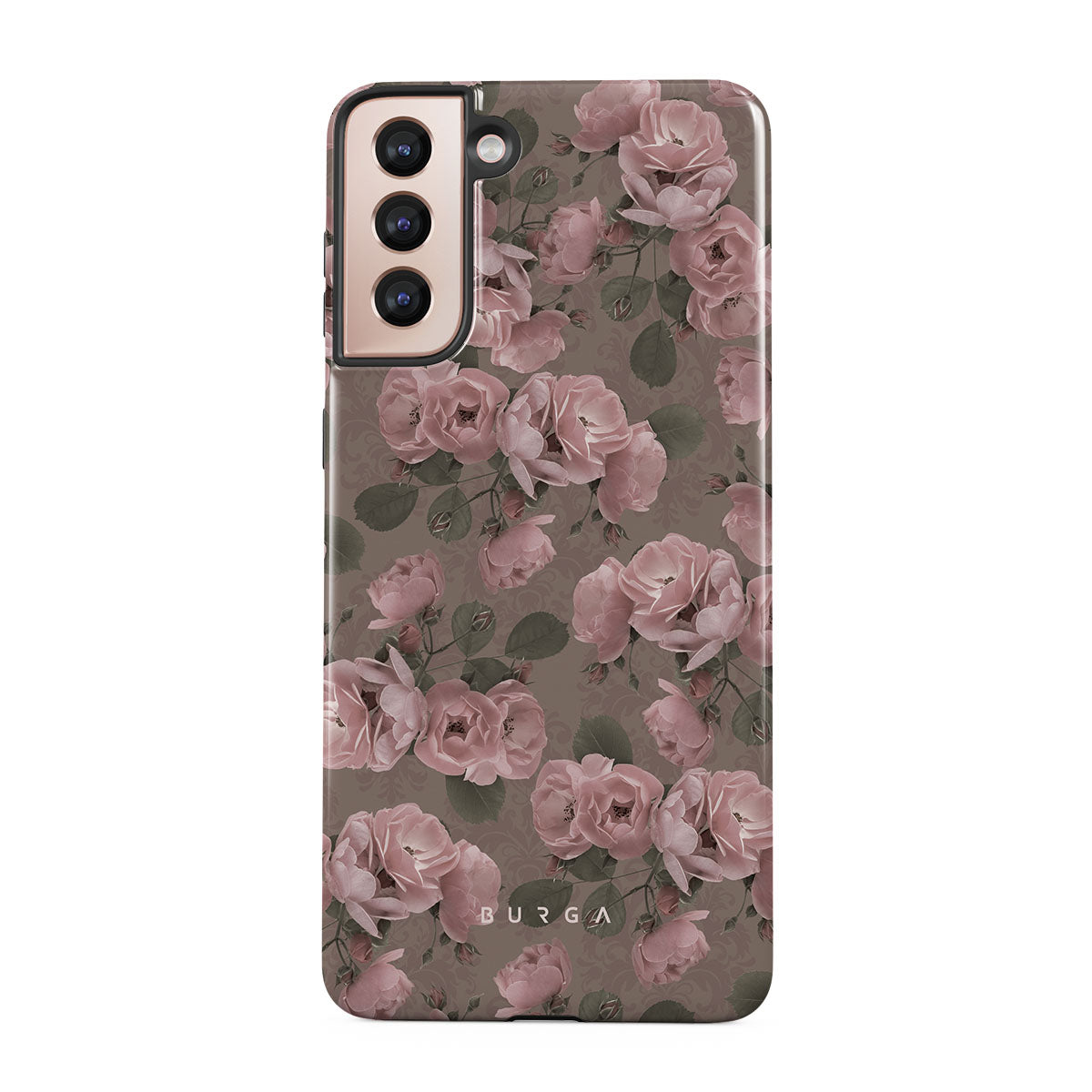 Blush, blooming roses transport you to an era of silent film stars and secret gardens. Our sophisticated Vintage Glamour Samsung Galaxy S21 Plus phone case design is perfect for the romantic at heart. It's for those who speak in glances and sighs and find comfort in the nostalgic whispers of floral romance.