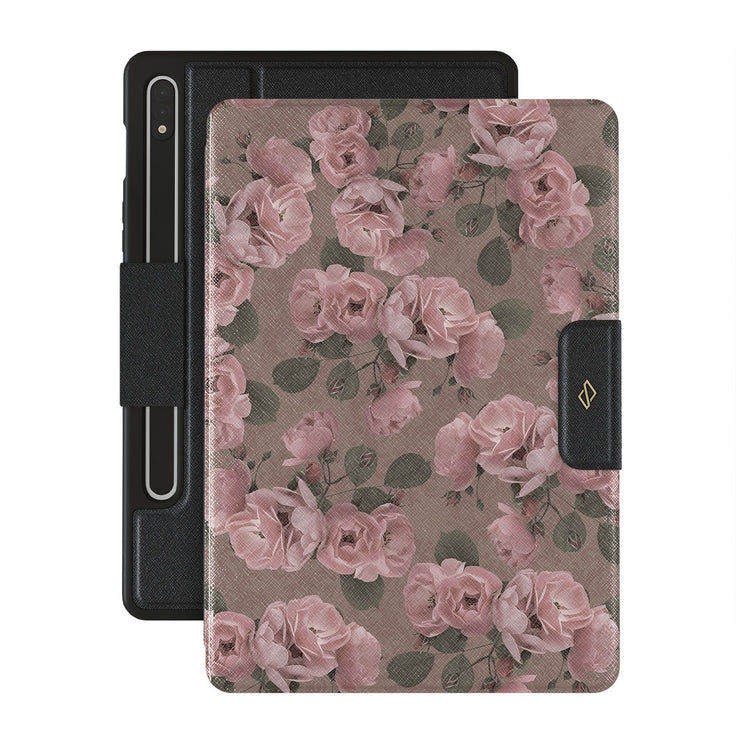 Blush, blooming roses transport you to an era of silent film stars and secret gardens. Our sophisticated Vintage Glamour Samsung Galaxy Tab S9 folio casedesign is perfect for the romantic at heart. It's for those who speak in glances and sighs and find comfort in the nostalgic whispers of floral romance.