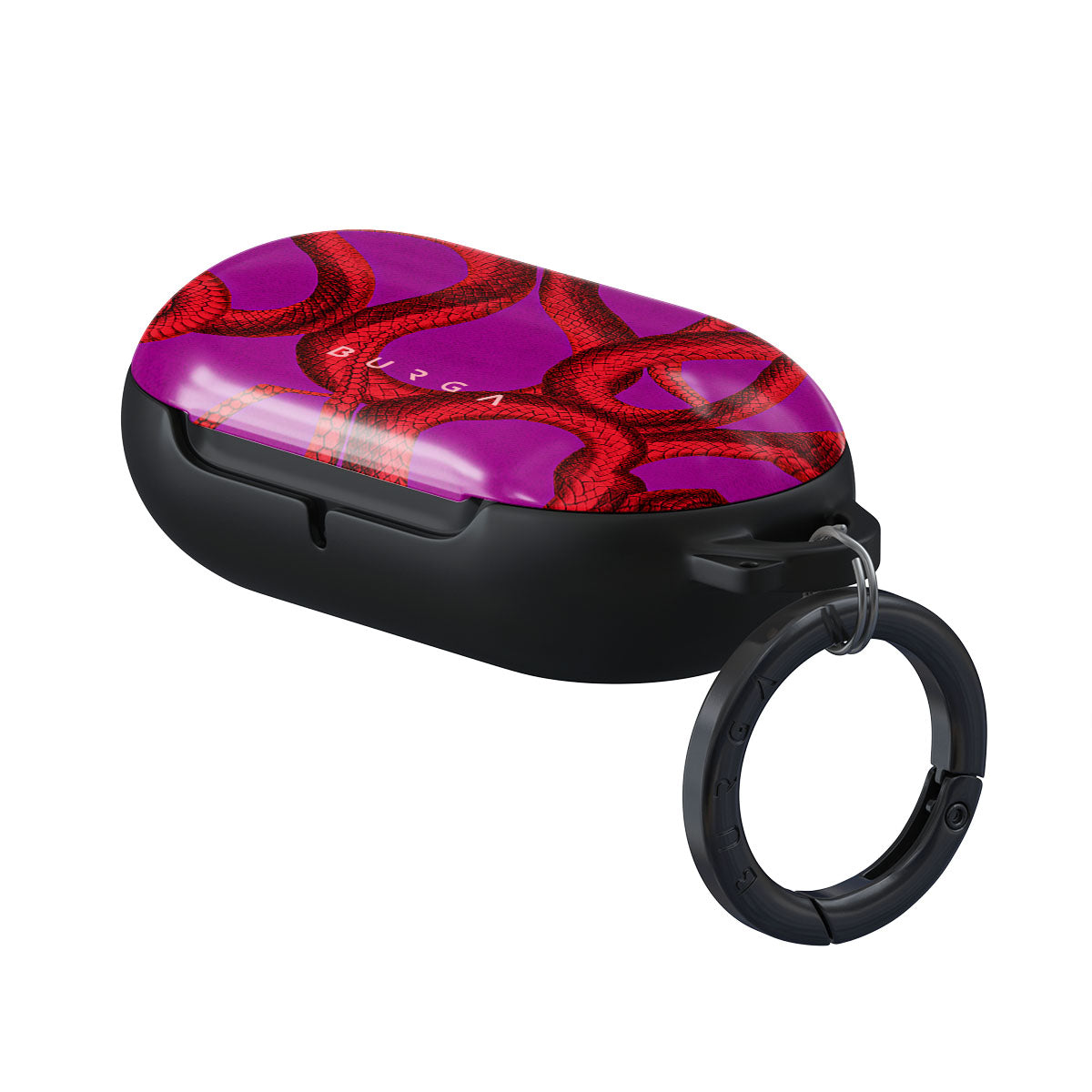 Up your accessory game with a fierce magenta Samsung Galaxy Buds Headphones case cover featuring dangerously red snakes. A protective cover does not need to be plain or boring; add a color explosion to your day and keep your Samsung Galaxy Buds safe and sound. Our case fits perfectly snug around Samsung Galaxy Buds Headphones. “Like a glove!” one might say. And it won’t disrupt the wireless charging capabilities of the newer model. There’s even an LED light indicator to prove it (don’t worry, wired charging still works, too). When fitted, the BURGA case will protect the delicate Samsung Galaxy Buds Headphones case beneath it from scratches, bumps, and drops while remaining scratch-free itself. Our signature design pattern prints are High Quality, and will never peel or fade away- thanks to our unique printing technology. And finally, a handy carabiner is there to make your life easier and more convenient: just snap it around your keys or belt loop and tackle the day head-on. Your music is right there by your side when you need it.