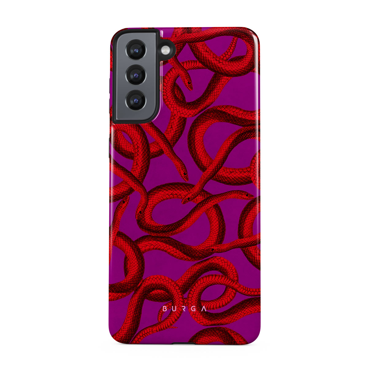 Watch Out Samsung Galaxy S21 phone case design offers a fierce feel with a bright magenta colored background covered in red snakes pattern. Make a statement while protecting your phone, as this case is guaranteed to catch everyone's eye.