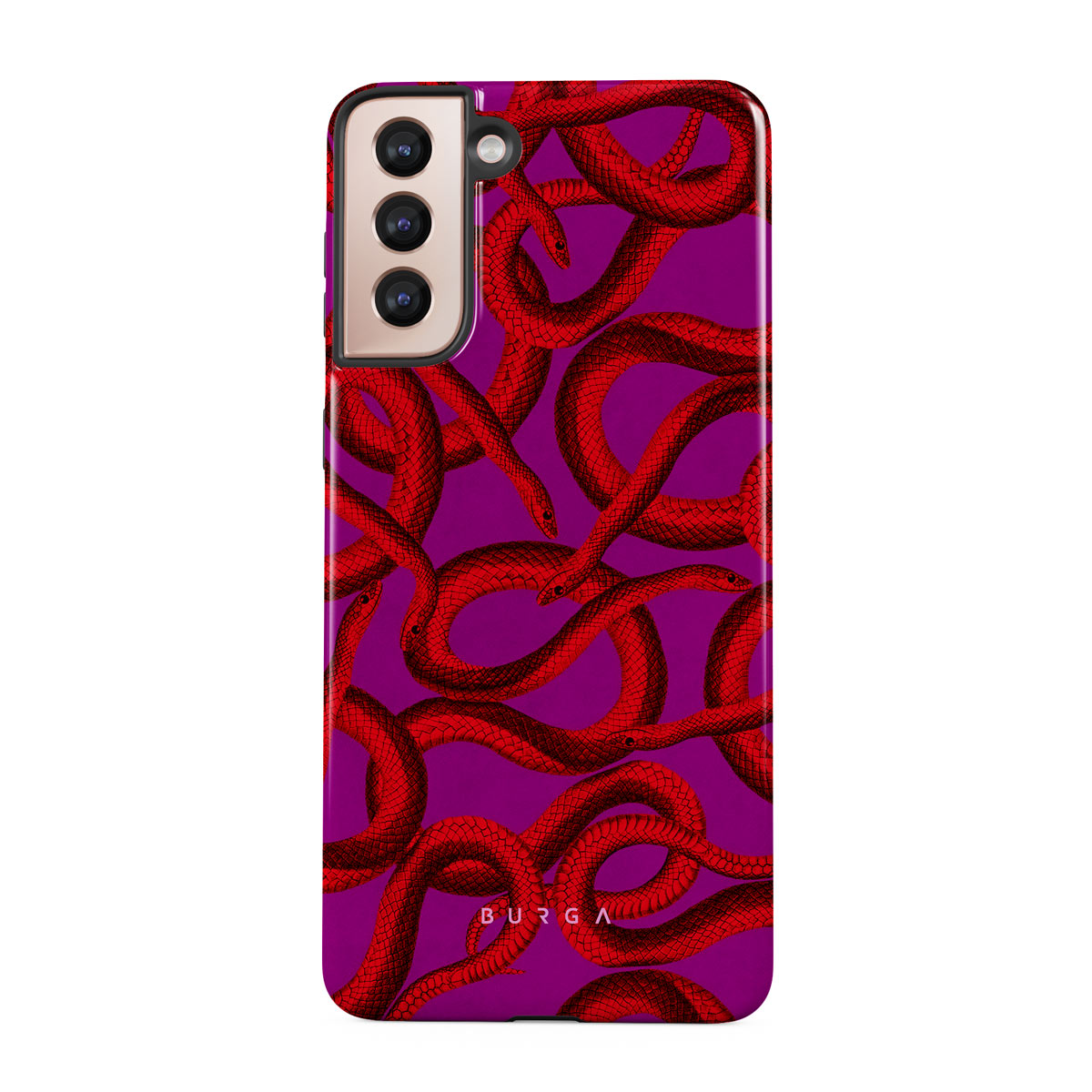Watch Out Samsung Galaxy S21 Plus phone case design offers a fierce feel with a bright magenta colored background covered in red snakes pattern. Make a statement while protecting your phone, as this case is guaranteed to catch everyone's eye.