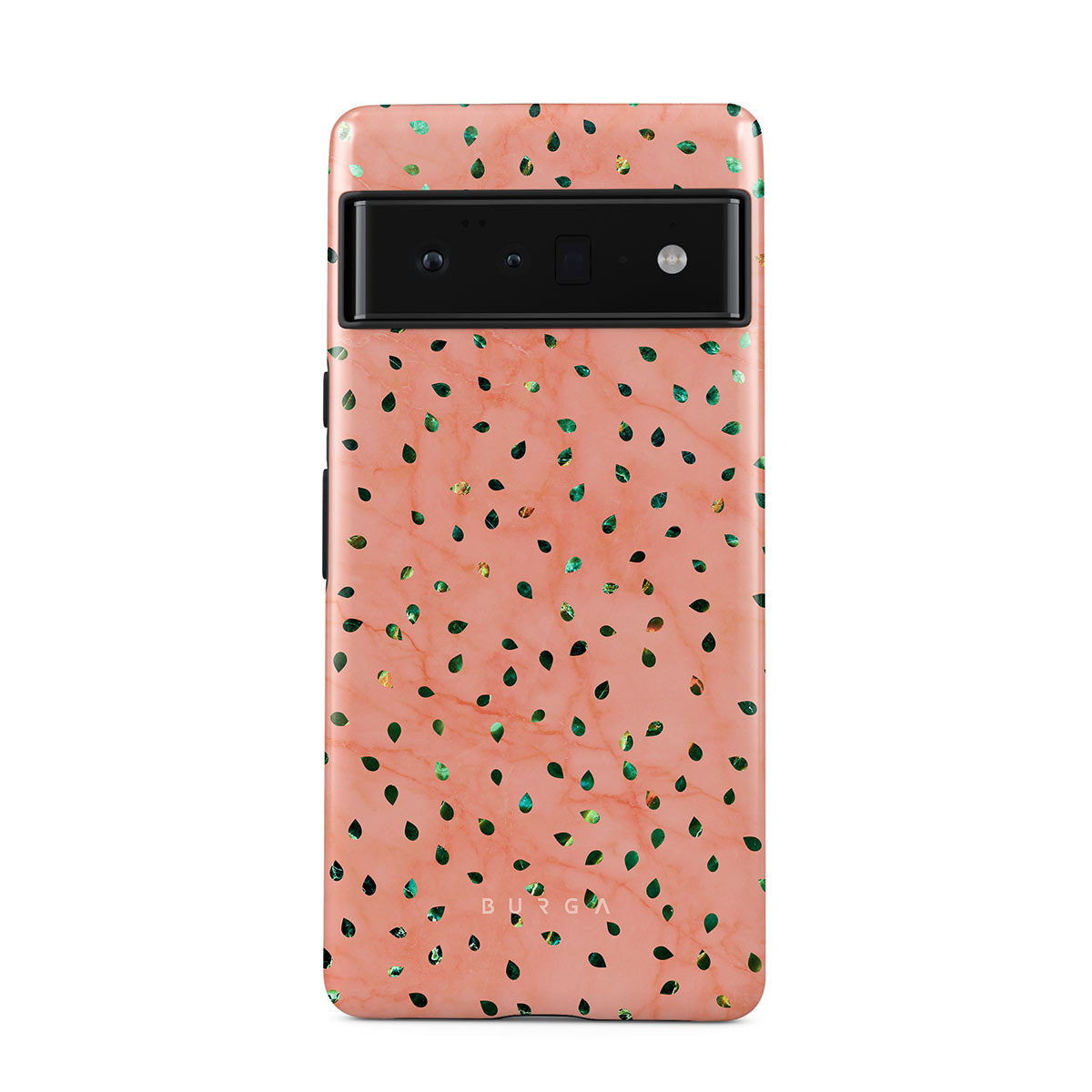 The Watermelon Shake Google Pixel 6 Pro phone case offers a playful take on design merging. The watermelon seed-like specks showcase striking tropical design fragments that add a splash of color to the fresh and breezy coral pink marble. This way, the funny protective phone cover becomes a perfect statement piece for your summer outfits.