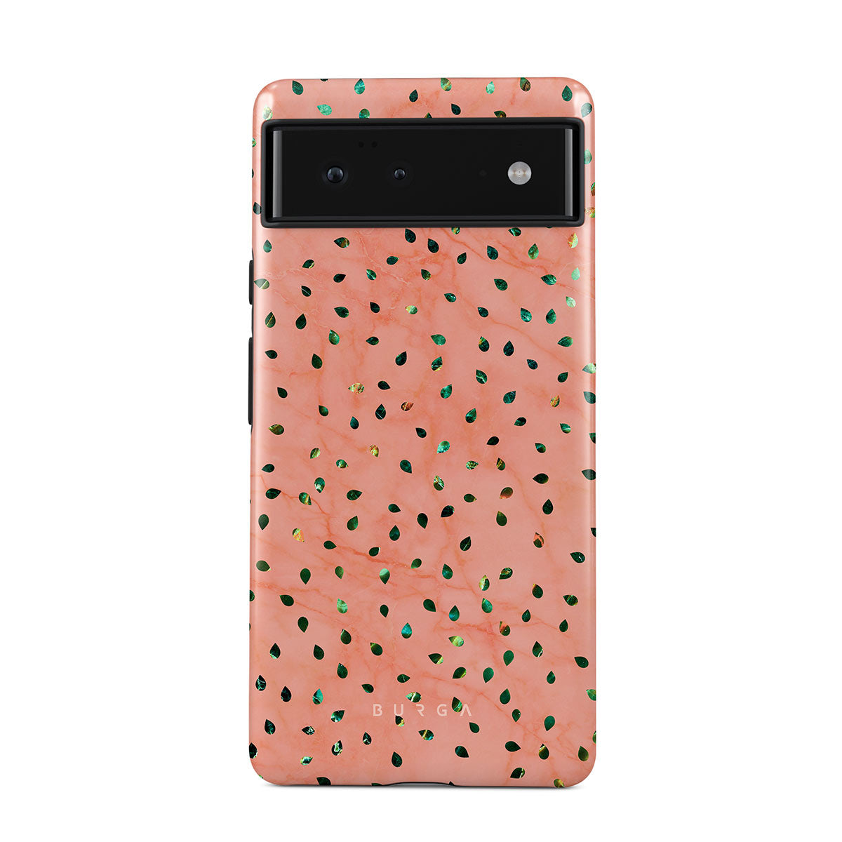 The Watermelon Shake Google Pixel 6a phone case offers a playful take on design merging. The watermelon seed-like specks showcase striking tropical design fragments that add a splash of color to the fresh and breezy coral pink marble. This way, the funny protective phone cover becomes a perfect statement piece for your summer outfits.