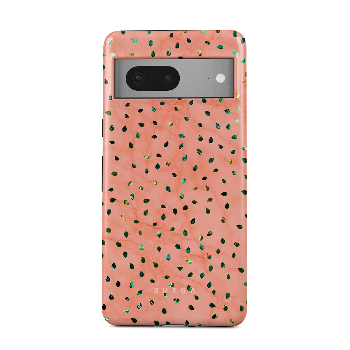 The Watermelon Shake Google Pixel 7a phone case offers a playful take on design merging. The watermelon seed-like specks showcase striking tropical design fragments that add a splash of color to the fresh and breezy coral pink marble. This way, the funny protective phone cover becomes a perfect statement piece for your summer outfits.