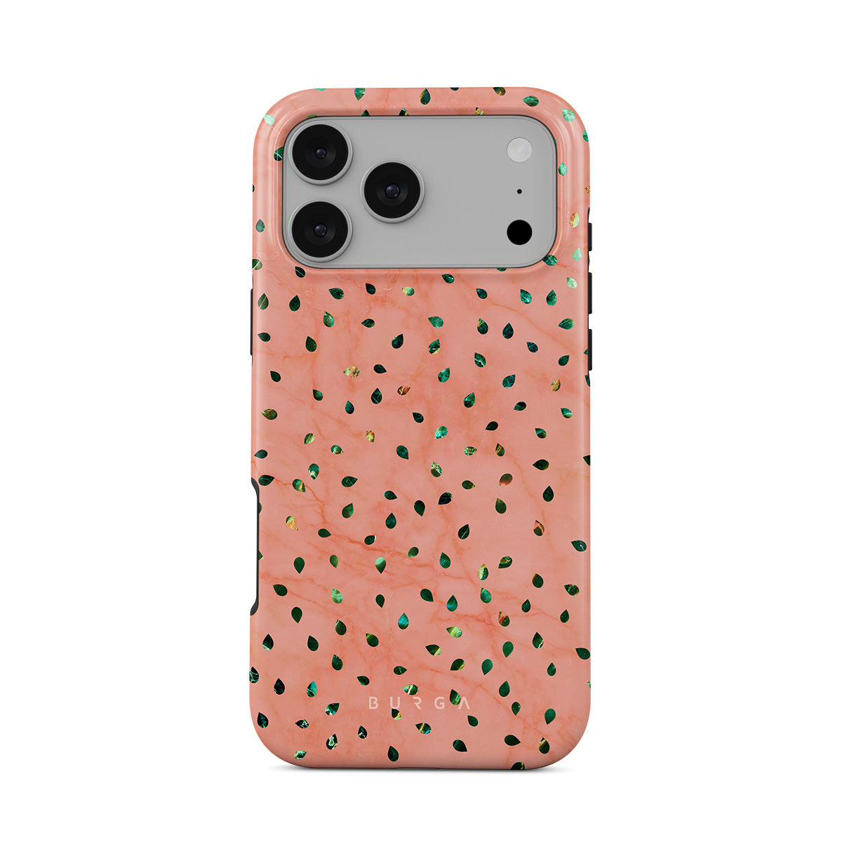 The Watermelon Shake iPhone 17 Pro Max phone case offers a playful take on design merging. The watermelon seed-like specks showcase striking tropical design fragments that add a splash of color to the fresh and breezy coral pink marble. This way, the funny protective phone cover becomes a perfect statement piece for your summer outfits.