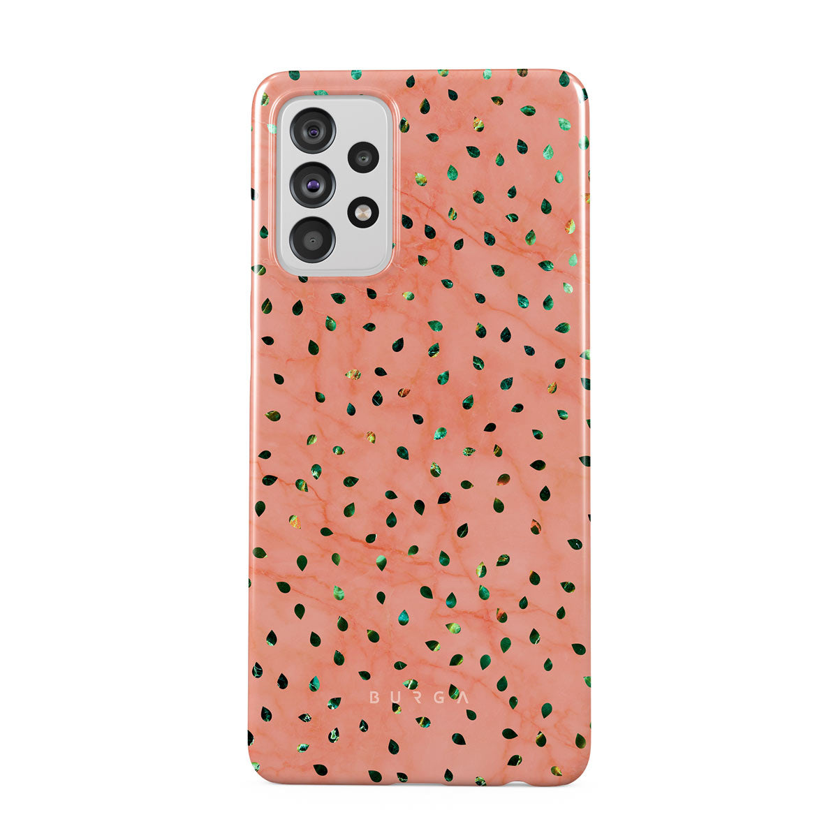 The Watermelon Shake Samsung Galaxy A72 phone case offers a playful take on design merging. The watermelon seed-like specks showcase striking tropical design fragments that add a splash of color to the fresh and breezy coral pink marble. This way, the funny protective phone cover becomes a perfect statement piece for your summer outfits.