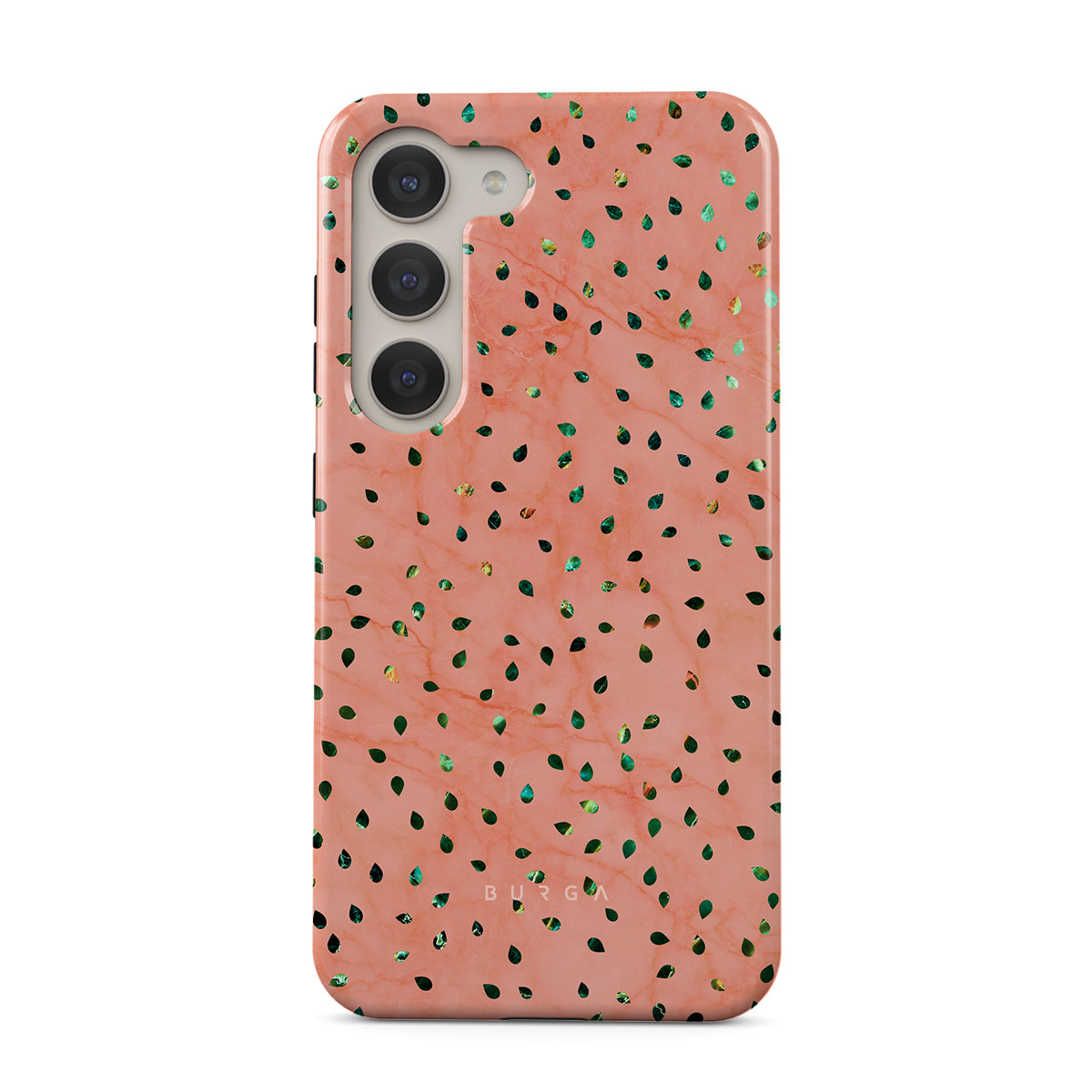 The Watermelon Shake Samsung Galaxy S23 Plus phone case offers a playful take on design merging. The watermelon seed-like specks showcase striking tropical design fragments that add a splash of color to the fresh and breezy coral pink marble. This way, the funny protective phone cover becomes a perfect statement piece for your summer outfits.
