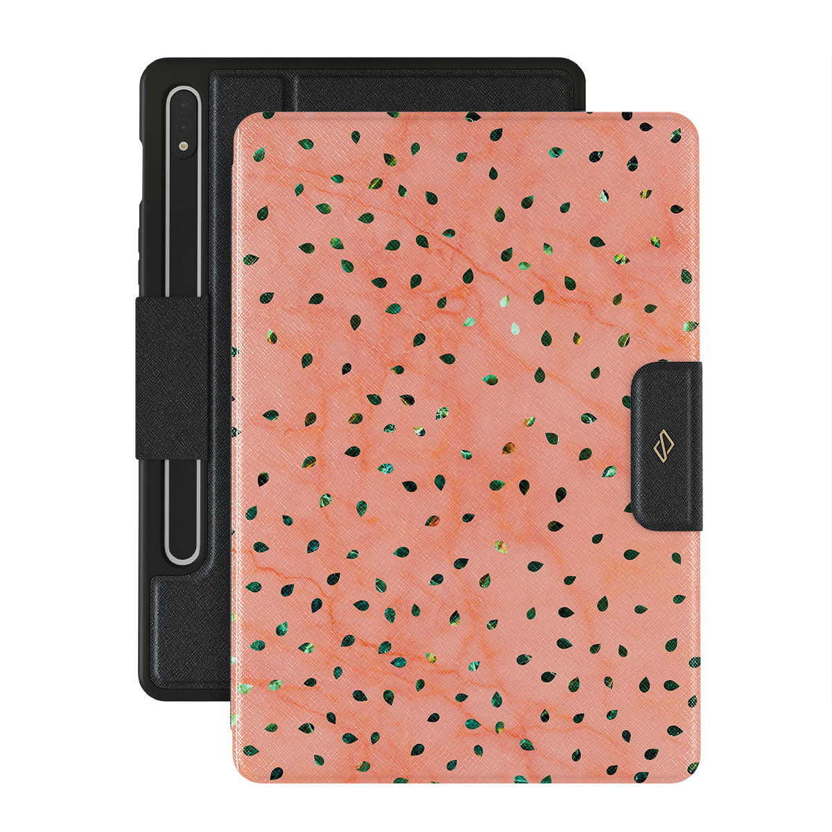 The Watermelon Shake Samsung Galaxy Tab S8/S7 folio case offers a playful take on design merging. The watermelon seed-like specks showcase striking tropical design fragments that add a splash of color to the fresh and breezy coral pink marble. This way, the funny protective Galaxy Tab cover becomes a perfect statement piece for your summer outfits.