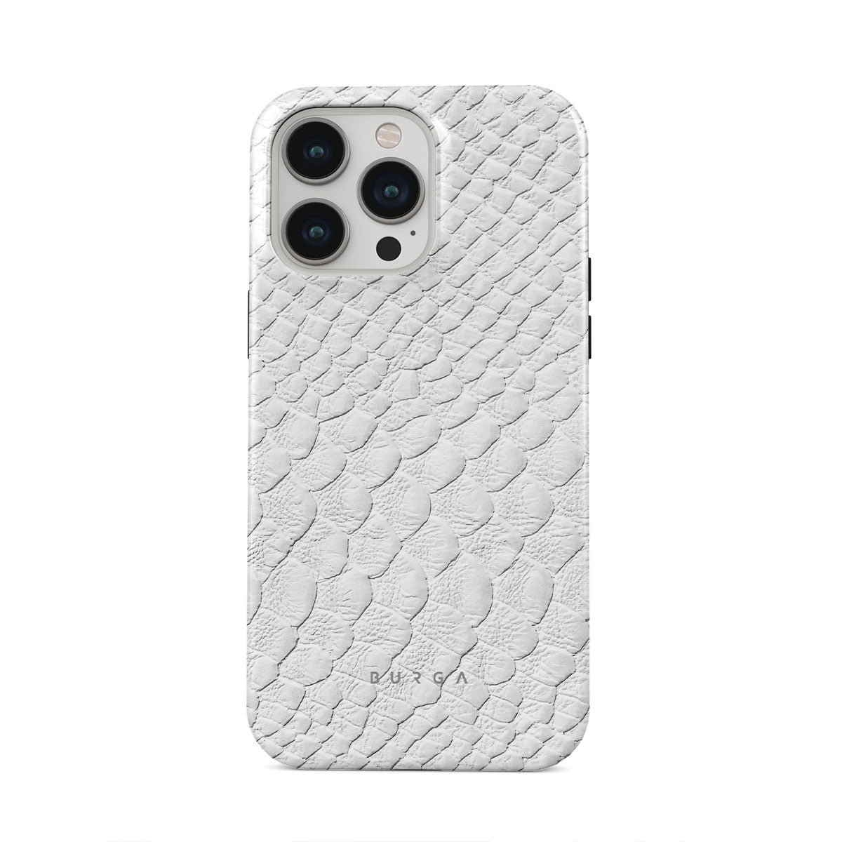 Glacial Desert iPhone 14 Pro phone case features snakeskin design in glacial white color. The dangerous animal print will add confidence and a touch of luxury to your style while transforming your phone into a fashion accessory.