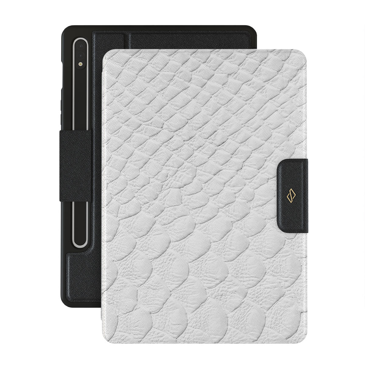 Glacial Desert Samsung Galaxy Tab S10+ folio case features snakeskin design in glacial white color. The dangerous animal print will add confidence and a touch of luxury to your style while transforming your Galaxy Tab into a fashion accessory.