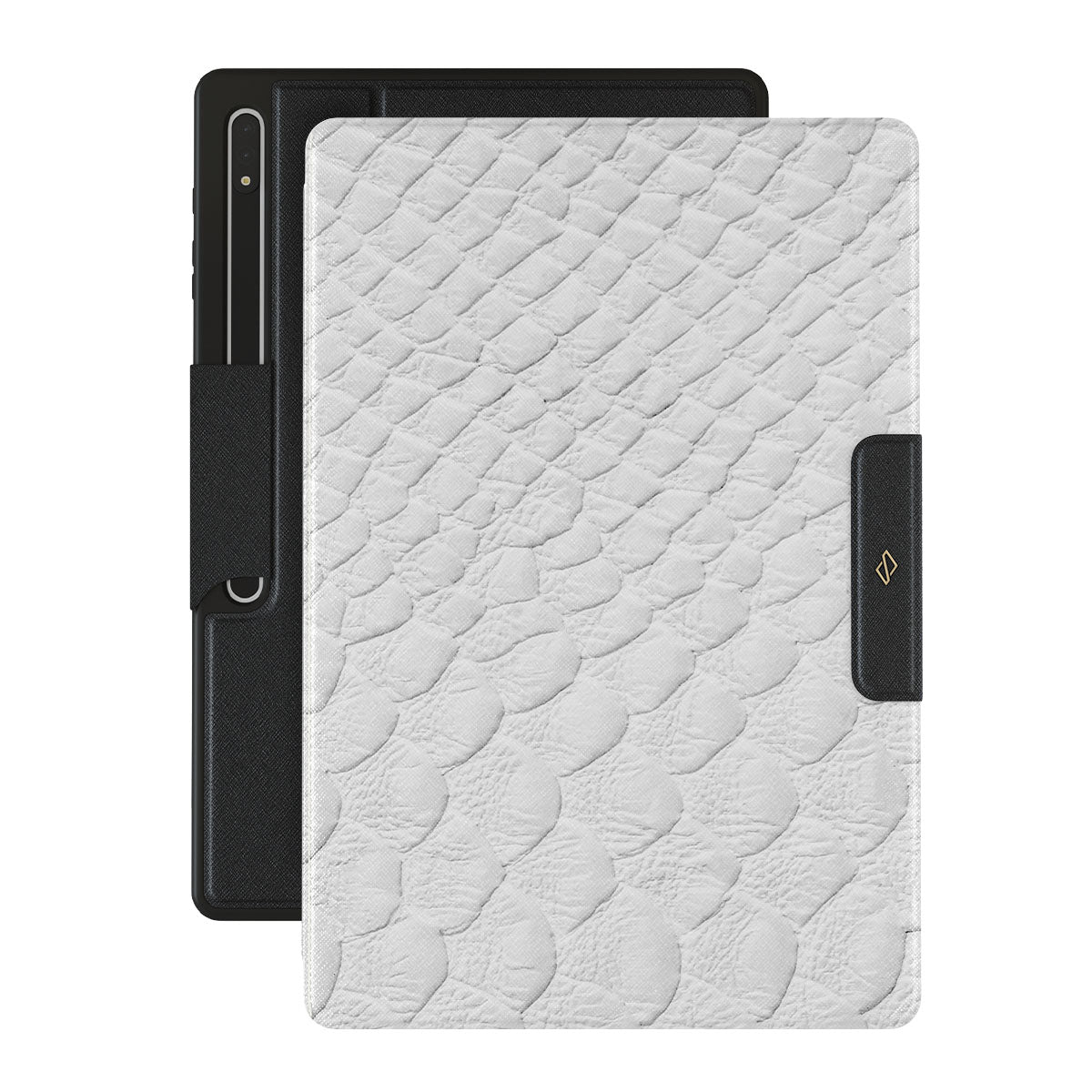 Glacial Desert Samsung Galaxy Tab S8 Ultra folio case features snakeskin design in glacial white color. The dangerous animal print will add confidence and a touch of luxury to your style while transforming your Galaxy Tab into a fashion accessory.