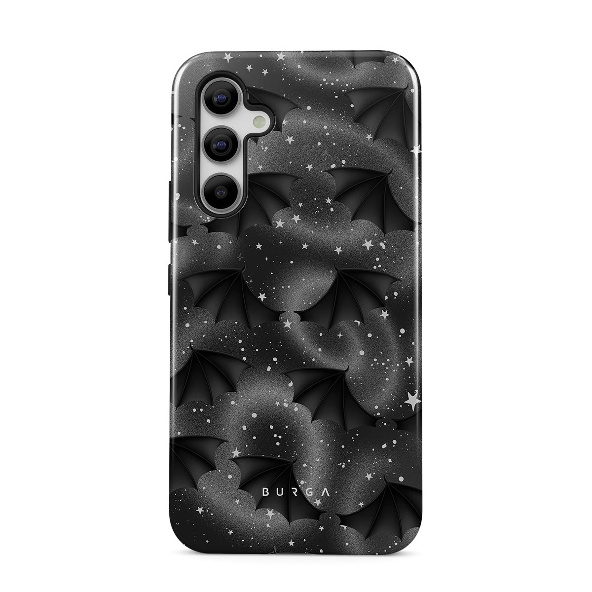 This design features: bat wings, stars, mystical swirls, black sky