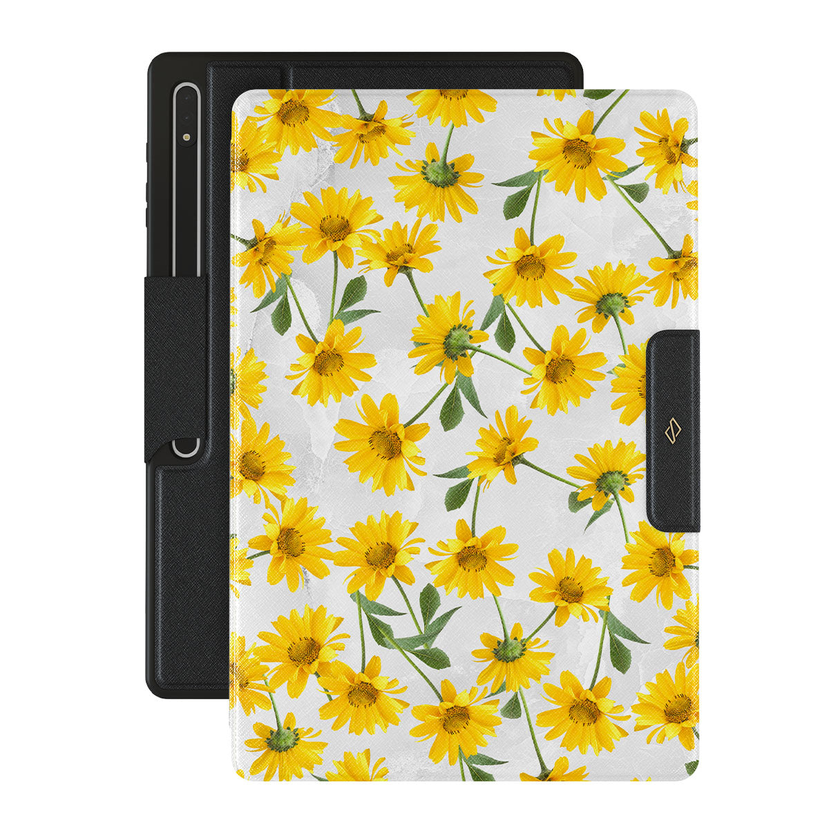 Little suns, little suns all around. Take the light of the summer whenever you go with the pretty pattern of the yellow flowers on your Samsung Galaxy Tab S8 Ultra folio case to brighten your week, day, or a minute. A splash of color and heavy-duty protection is a perfect combo for your Galaxy Tab.