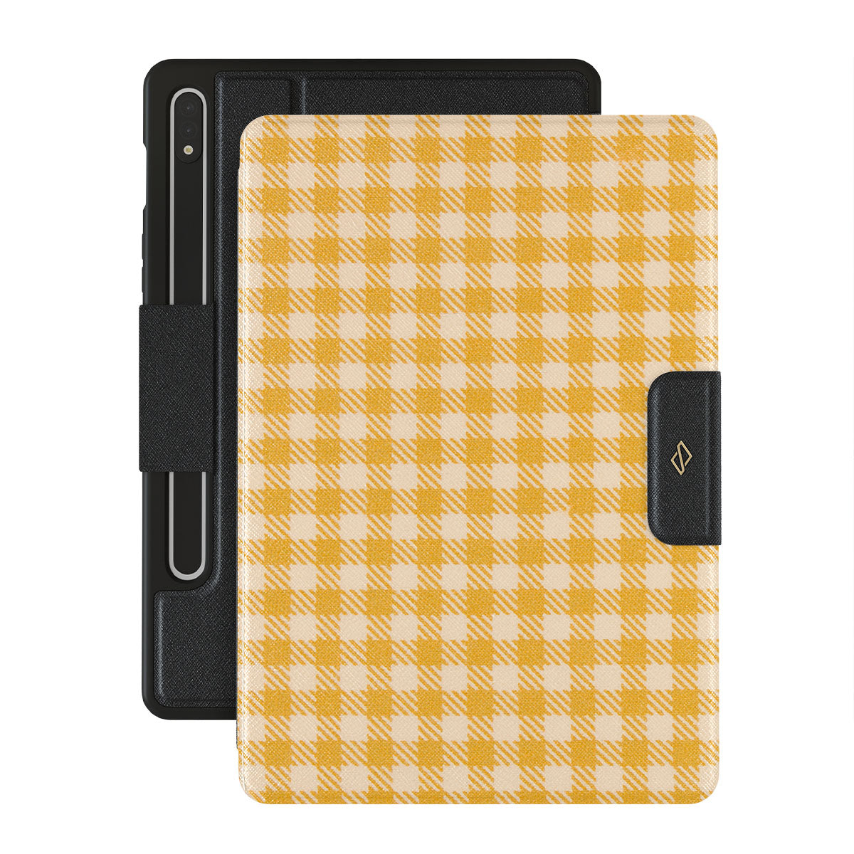 Always fashionable and always inviting, the Preppy Vichy fabric returns in our Tuscan Sun Samsung Galaxy Tab S8+/S7+/S7 FE folio case. The brightness and warmth of this enchanting yellow plaid design indeed remind us of the always generous Tuscan Sun. You can add a piece of this playful squares pattern with you while keeping your Galaxy Tab out of harm's way!